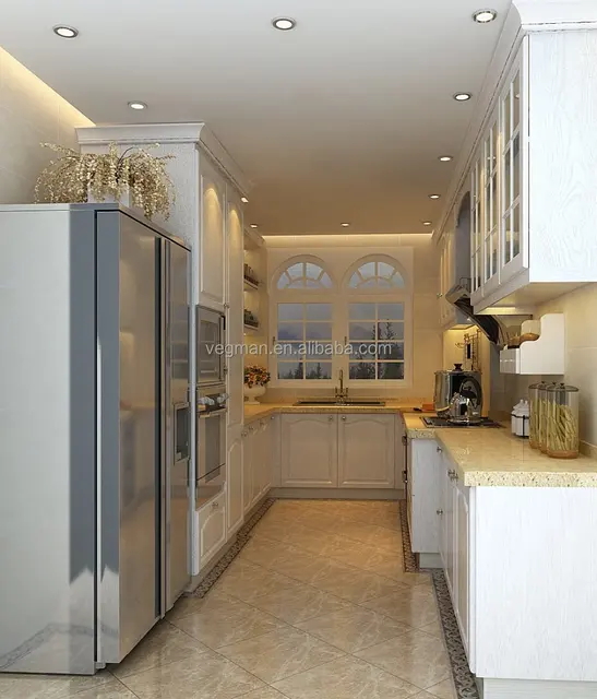 Country Style U Shaped White Kitchen Cabinet For Small Kitchen